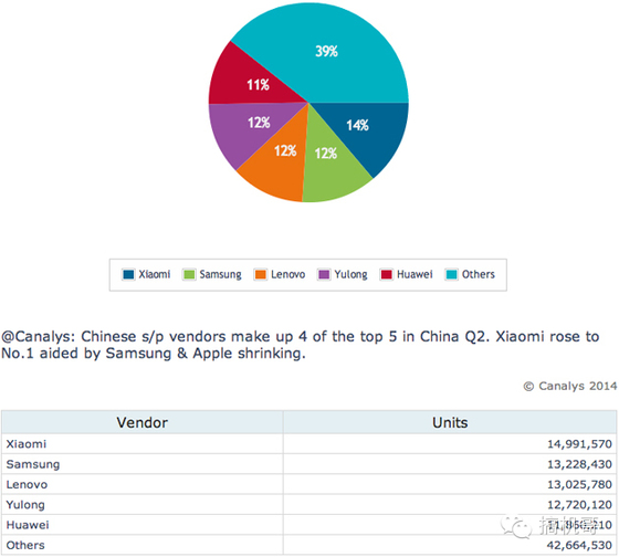 最近 Canalys 公布了一個(gè)有關(guān)中國智能手機市場(chǎng)狀況的調查,結果顯示在 2014 年 Q2 里,賣(mài)得最多手機的頭五位里,有四間都是大陸公司,分別是小米、聯(lián)想、酷派和華為,當中小米排第一,而唯一的外國公司就是排在第二的三星,驚喜的是蘋(píng)果竟被它們擠到五甲之外呢。